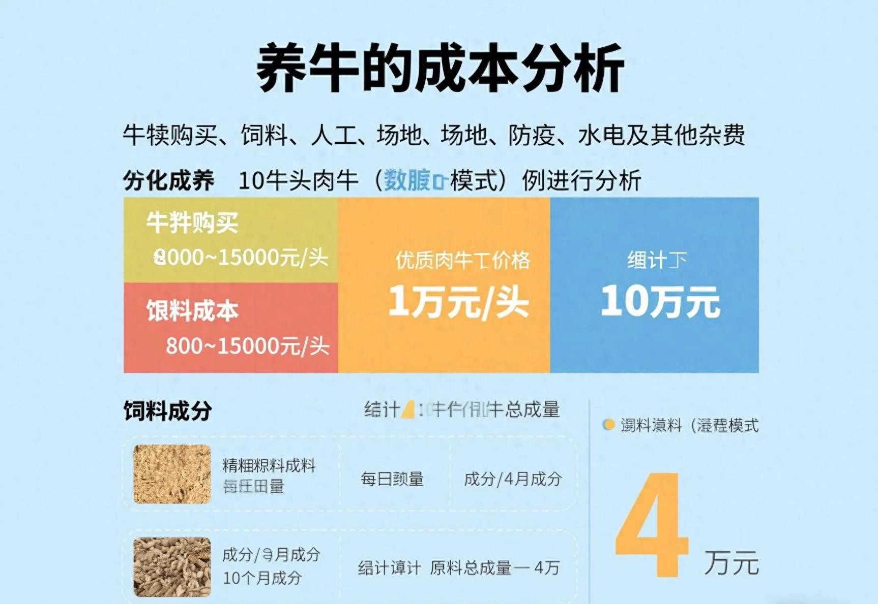 目前市场上优质肉牛犊(如西门塔尔、夏洛莱等)的价格在8000~15000元/头,具体取决于品种、体重和地区。按均价1万元/头计算,10头牛犊总成本: