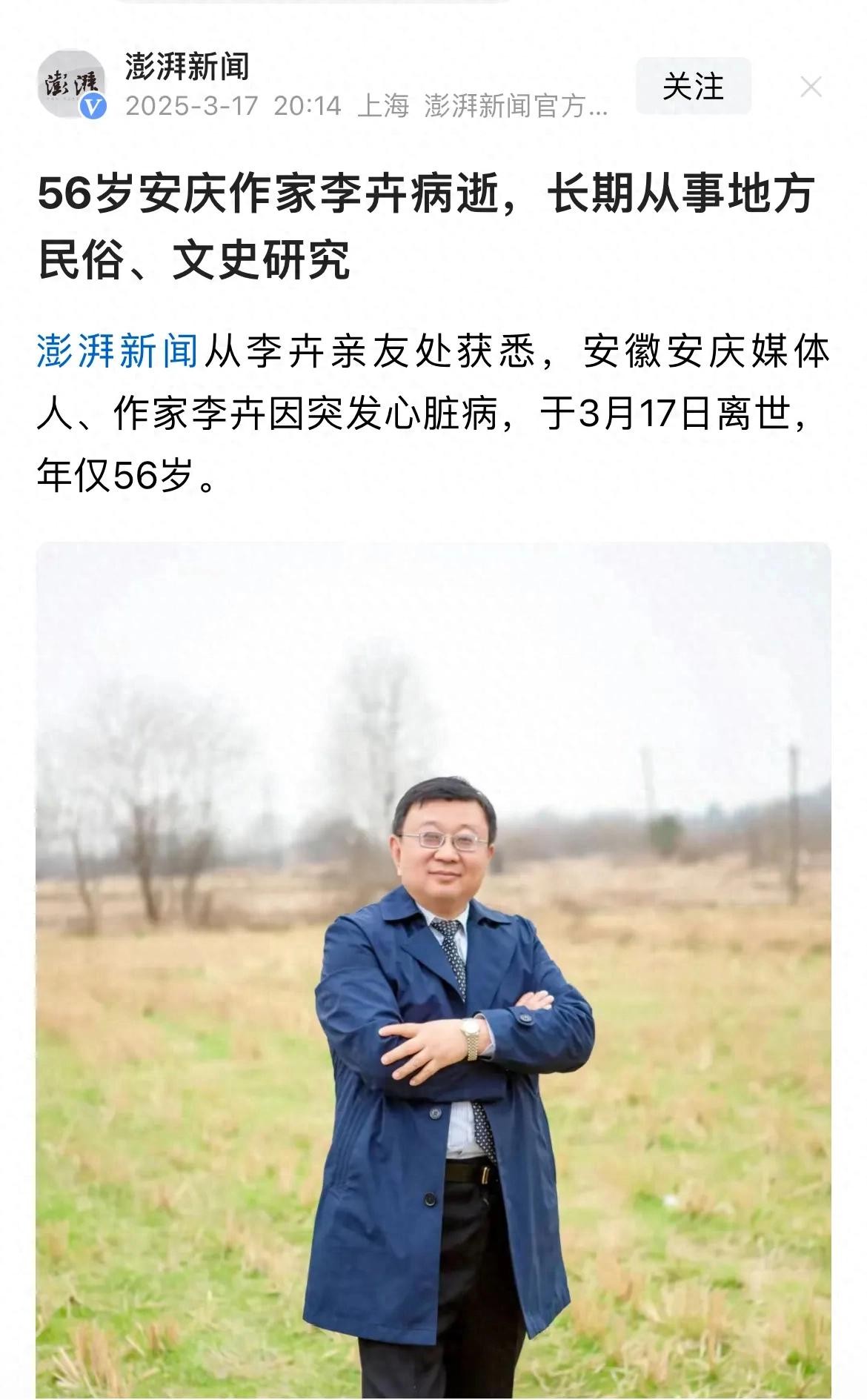 3月17日,56岁的安庆作家李卉突发心脏病离世。这位以《此地宜城》记录城市灵魂的媒体人,最终倒在了“贪酒熬夜胡吃海喝”的生活习惯下,引发一片唏嘘。