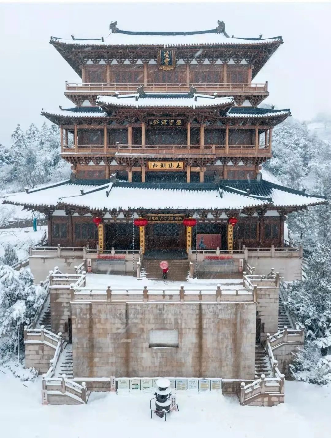 白雪覆盖的树木,环抱这座红色的楼阁。