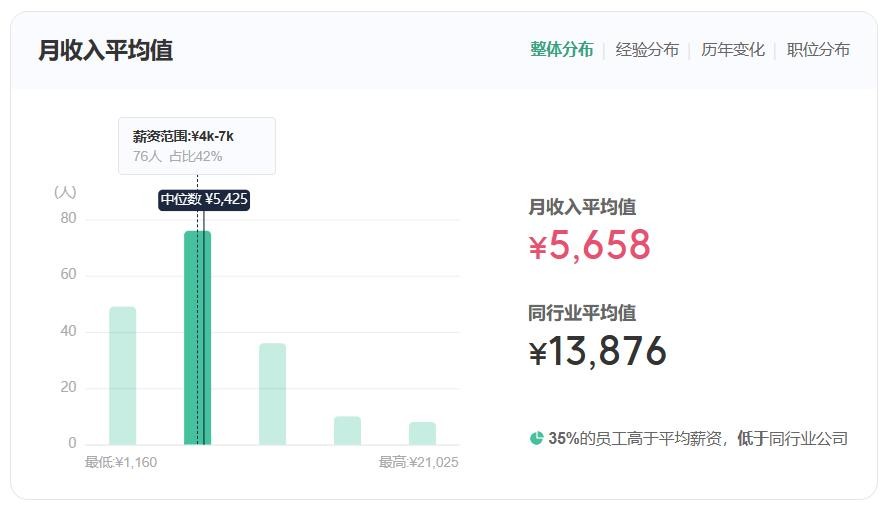 不同岗位的员工的平均月收入情况:技术岗位平均月收入7624元,生产制造岗位平均月收入5269元,管培生岗位平均月收入2523元,人事/财务/行政岗位平均月收入4700元,房地产岗位平均月收入7049元,供应链岗位平均月收入3944元。
