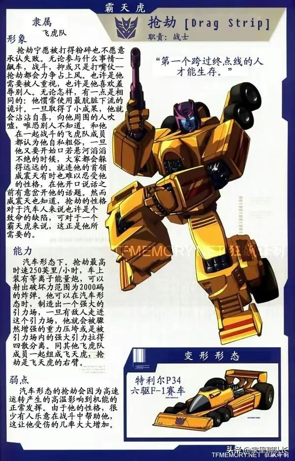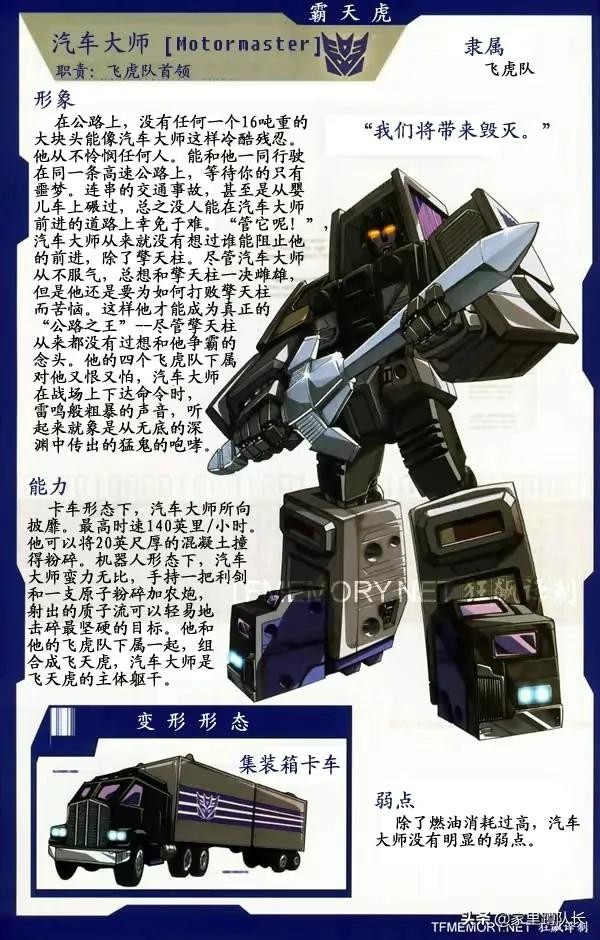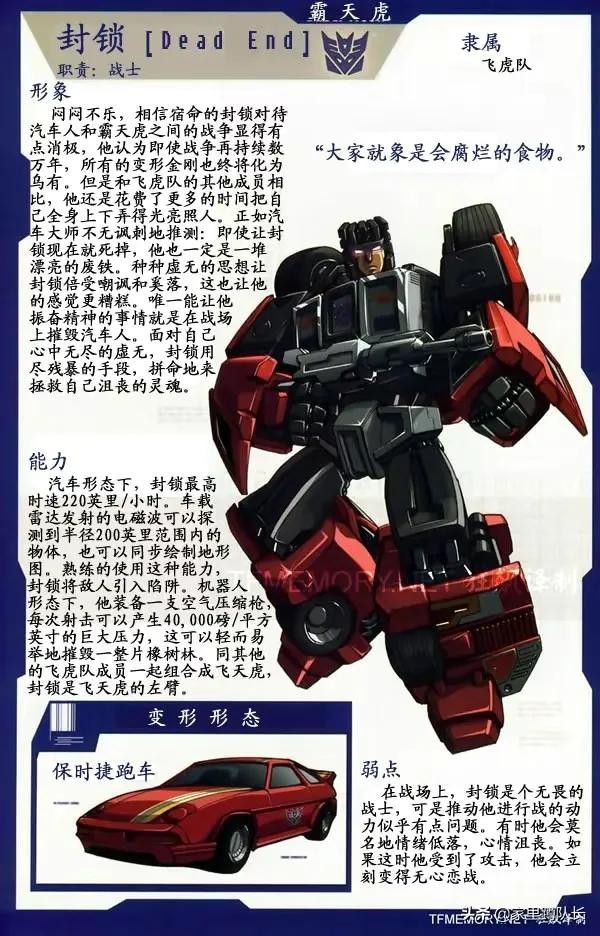 【个人档案】[监禁报告 D3111931-D3111935 号(汇编)。报告人:博派安全主管红色警报] 看到这五个(或者说六个)疯子被关起来,不能再进行破坏,我的传感电路真是说不出的轻松。 这帮所谓的“飞虎队”是最难以琢磨又极度危险的狂派小队。他们每个人的精神状态都极不稳定,比他们那些嗜油如命的狂派同伙具有更强的暴力倾向。他们的精神问题、暴力嗜好和彼此冲突的个性,使得他们的合体形态飞天虎在赛伯坦上极具威胁性。实际上,飞虎队的五个队员并不适合组成像飞天虎这样具有强大摧毁力的合体金刚。当头脑中的精神分裂过于严重时,飞天虎就会变得异常狂躁,直至失控。此时他单手一挥所造成的死伤和破坏,往往能够胜过一打全副武装的狂派士兵。