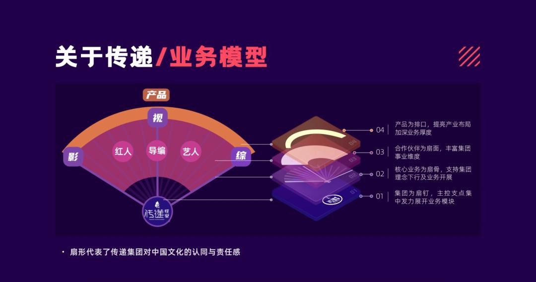 传递娱乐在创作上展现出来的匠心更是不胜枚举。比如《理想之城》光是剧本就打磨了四年,拍摄前后历时245天;《萌探探探案》所有置景都按照原剧的质感进行复刻,只为让观众获得身处其中的“沉浸感”;为了拍好《棋魂》,创作团队不仅邀请职业棋手作为专业顾问,在拍摄之前更集体“开小灶”,学习围棋技能,解锁围棋理论和实操,观察专业棋手的生活和工作状态。好的制度和高效的管理体系,是支撑传递娱乐持续生产好内容的“永动机”。作为港股上市公司,传递娱乐以影视综内容创制作为主要商业价值赋能,业务涉及电影、电视剧及综艺节目的制作与发行,艺人、红人经纪等多个维度。去年年初,传递娱乐从最初的“金字塔阶段”转向扇形业务模型——以传递娱乐集团为扇钉主控,影视综核心业务线为扇骨,包括导演、编剧、艺人在内的人才和合作伙伴为扇面。