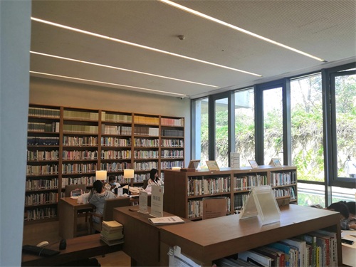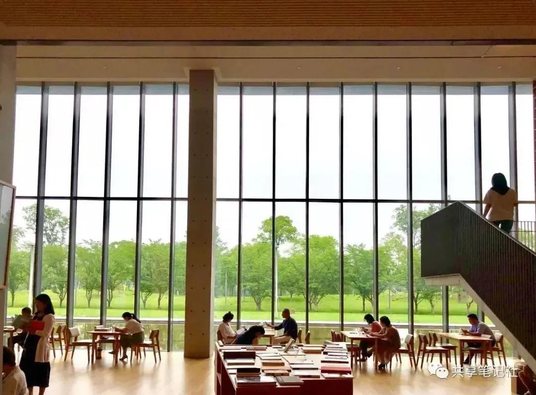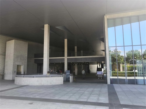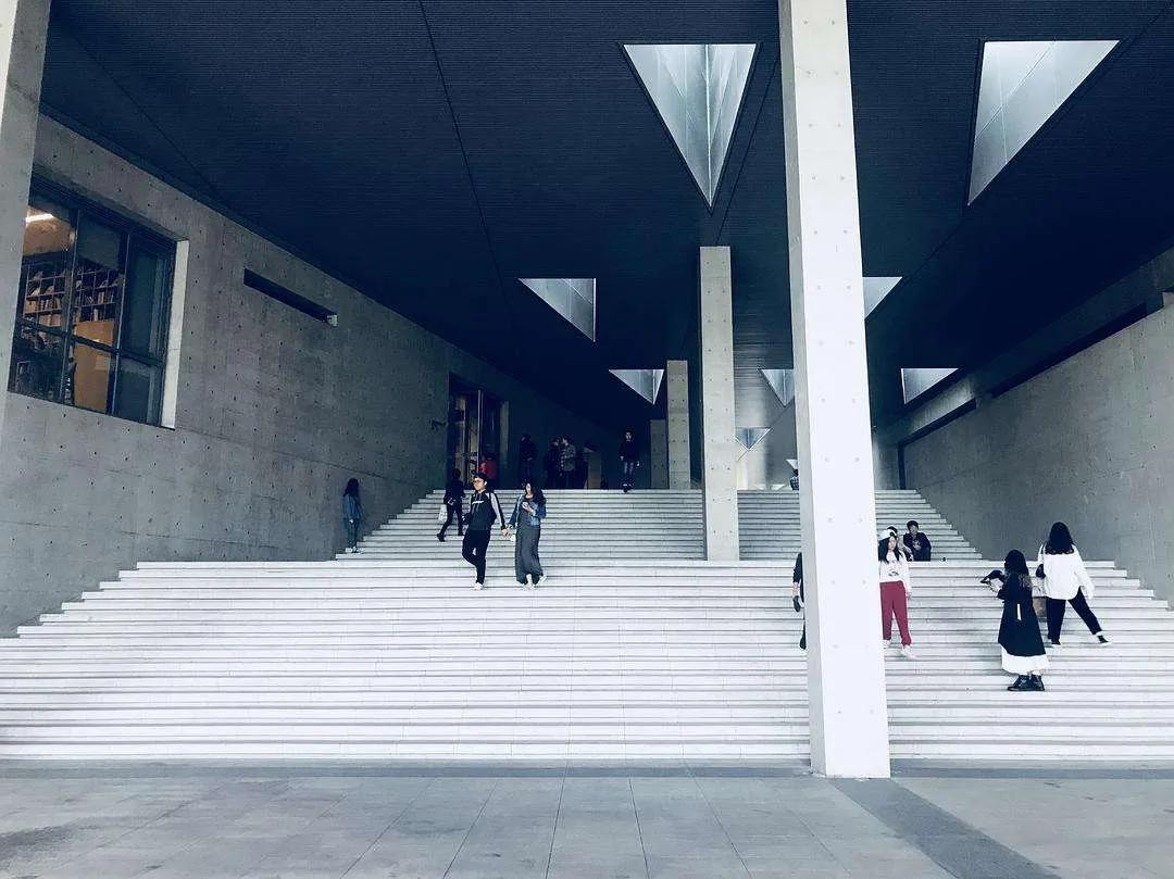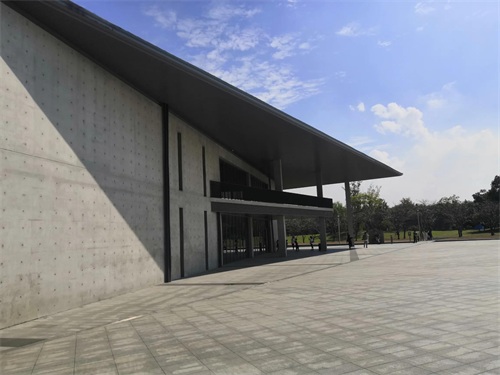 大屋顶外墙运用清水模工法,直接裸露出未加修饰与贴面的混凝土。呈现混凝土自然朴实、不加修饰的刚硬质感,给人以朴实自然之美。大屋顶外观简洁、明快,大气。巨大的屋顶与不同的功能区自然天成,十分和谐的浑然一体。建筑的东北边设计了一片浅水池,从室内的二楼有宽大的台阶直达浅水池边,台阶的宽度近似于我们通常所见的楼、堂、馆、所的进门台阶。在结构单纯,看似封闭的内部设计了数十个三角形采光窗,引入自然光,从早到晚,随时间推移产生丰富的光影变化;夜晚来临时水面倒映出直线窗棂与室内光影和巨大展示书格,营造出几何感强烈和富有禅意的空间。室外设计了包括了水景、广场、绿地、樱花林等。春季樱花盛开时这里繁花似锦,美不胜收,吸引了众多年轻人来此打卡赏樱。