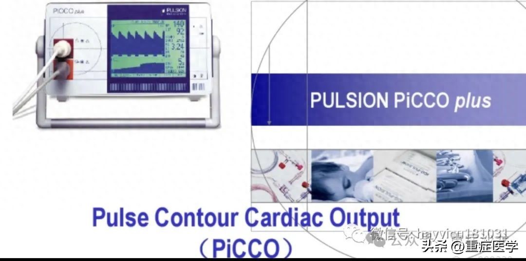 德国Pulsion医疗系统公司将肺热稀释法与动脉脉搏波形(pulse contour)分析技术结合起来制造出PICCO系统,该系统同时具备了CO连续监测功能和容量指标,并可监测血管阻力的变化。经肺热稀释法测心输出量CO、心脏指数 CI、胸内容量指数ITBI、全舒张末容积指数 GEDI、血管外肺水指数 ELWI 、肺血管通透性指数PVPI。通过经肺热稀释法对动脉脉搏轮廓法初次校正后,可以连续监测脉搏轮廓心输出量pulse contour cardiac output ,PCCO 、心率HR、每搏输出量 SV 、平均动脉压MAP 、容量反应(每搏输出量变异性SVV,脉搏压力变异性 PPV)、系统性血管阻力指数 SVRI 、左心室收缩力指数dPmax。