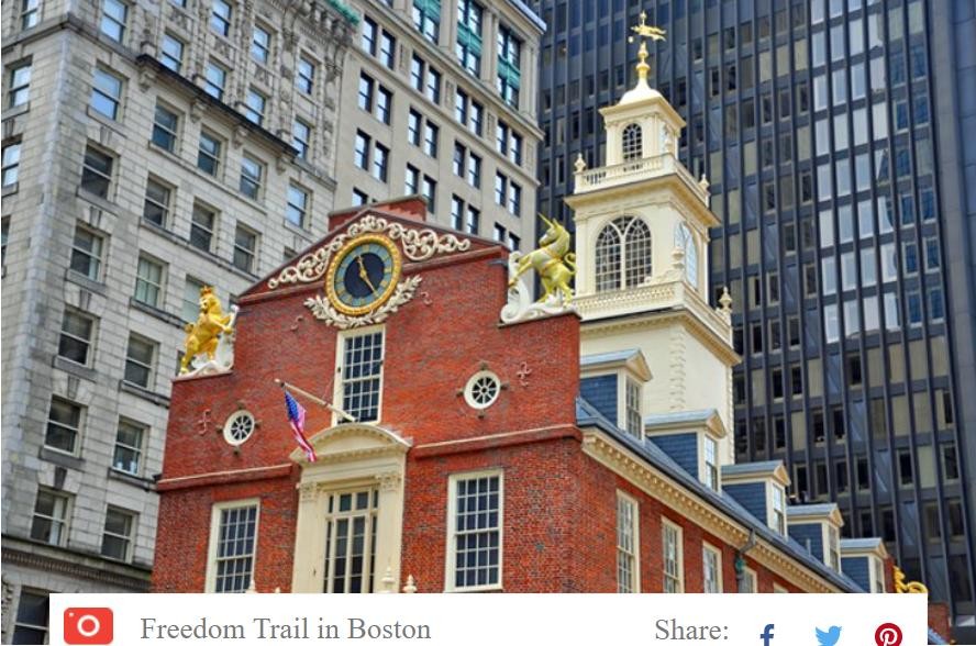 波士顿的自由之路(Freedom Trail)是一条2.5英里的步行路线,可经过该市一些最重要的历史景点。人行道上镶嵌着一排红砖,标志着这条路线,使游客可以轻松找到自己的出行方式。自由之路沿线的景点包括州议会大厦,旧州议会大厦,旧粮仓墓地,旧市政厅,法尼尔厅,保罗·里维尔大厦等等。
