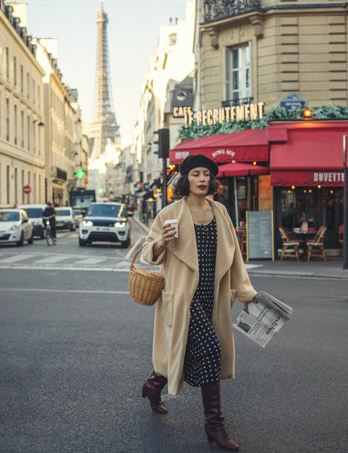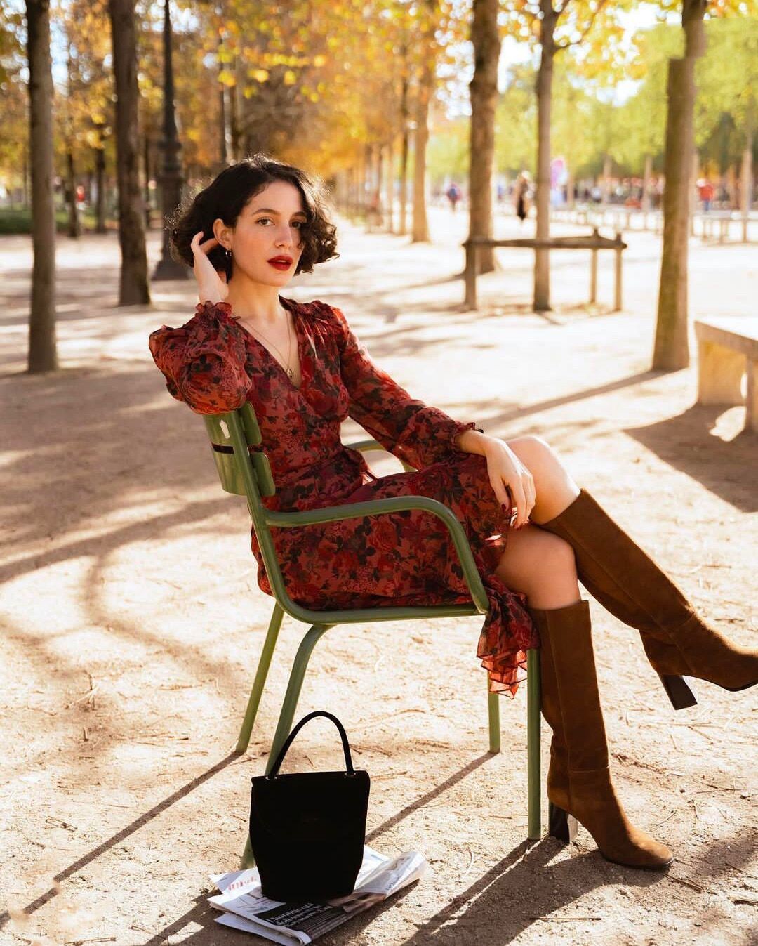 内搭一件黑色波点连衣裙和酒红色长靴,在明暗交替的色彩中建立起复古的浪漫,隐藏在低调冷静色彩下的,是优雅耐看的法式魅力。