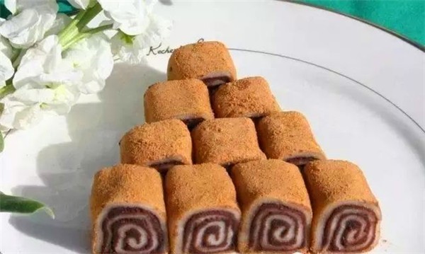 承德地区盛产黍米,承德叫黄米,性粘。“驴打滚”就是用黍米做成的一种大众化小吃,在承德已有200多年的历史。 “驴打滚”是用黄米夹馅卷成的长卷,因卷下铺黄豆面,吃时将长卷滚上豆面,样子颇似驴儿打滚,因此得名。 “驴打滚”的原料有大黄米面、黄豆面、澄沙、白糖、香油、桂花、青红丝和瓜仁。它的制作分为制坯、和馅、成型三道工序。做好的“驴打滚”外层粘满豆面,呈金黄色,豆香馅甜,入口绵软,别具风味,是老少皆宜的传统风味小吃。