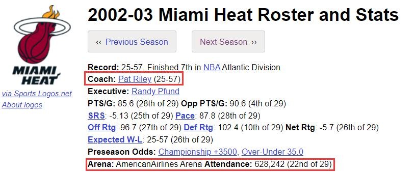 03-04赛季,热火队在开局七连败之后止住颓势,最终收获42胜40负,东区第四的战绩,杀入了季后赛。热火队的进攻效率联盟倒数,但好在场均失分89.7排在联盟第八,而且当年东部较弱,让他们得以突围。由于韦德并不是热门新秀,加上热火队内没有什么知名球星,这让他们的上座率持续下滑,并且没有获得全美直播的机会。