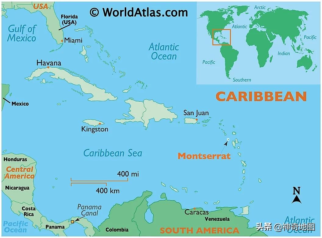 蒙特塞拉特岛(Montserrat)是英国殖民地,位于位于西印度群岛中背风群岛南部,安提瓜和瓜德罗普之间。岛屿面积102平方公里,人口最多时有1.3万,现在只剩下不到5千。