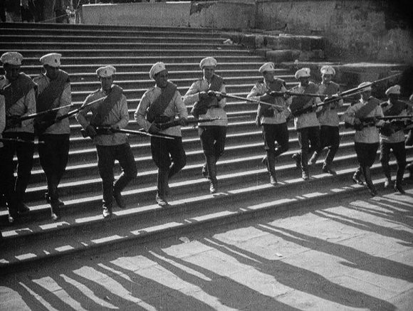 著名的敖德萨阶梯是电影史上蒙太奇运用的经典范例,片段的开始是小孩和妇女们的招手,欢呼,并没有运用全景介绍人物和环境的关系,而是将多个不相关联的特写,近景进行组接起来,使得人群像是在朝军舰欢呼和招手一样。突然一个男人头发散乱,面部表情狰狞,紧接着一个镜头是群众在敖德萨阶梯上惊慌失措的奔跑。将不同方位,不同视点,不同景别的群众奔跑镜头反复组接,实现了对时空的再造,扩大了阶梯的空间,使人们感觉敖德萨阶梯又高又长,感觉群众跑了很长时间还没有到达阶梯的底部,这种空间的变形渲染了沙皇军队的残暴。而另一个镜头是沙皇军队穿着统一的服装整齐的沿着阶梯一步一步的走下去,两者形成强烈的对比。