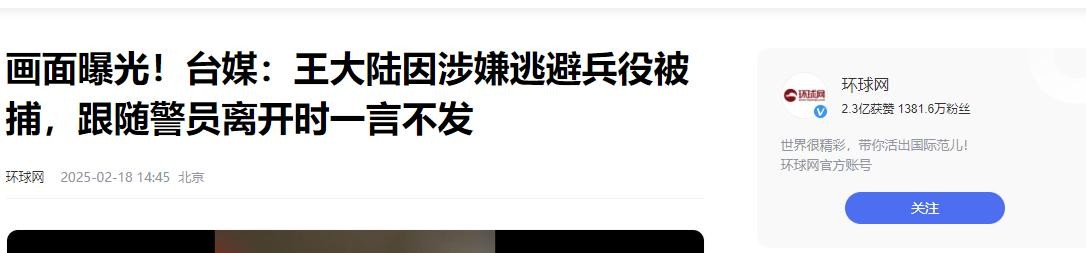画面曝光!台媒:王大陆因涉嫌逃避兵役被捕,跟随警员离开时一言不发.环球网.2025-02-18