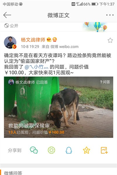 10月8日,浙江金华的应女士在新浪微博上,通过付费问答向微博认证为“杨文战律师”账号提问,称其因在路边捡到一条狗而被认定“偷盗国家财产”,进而寻求法律帮助。应女士的丈夫朱先生向记者回忆了当时的场景,“那天晚上,我和老婆吃完饭去公园散步,8点多路过多湖派出所门前的一条路,那里有一排垃圾桶,我老婆看到一只狗,在那边吃垃圾,当时是夏天,担心这狗会被渴死,很晚了,也没有看到它被栓绳子,我离它十几米远的时候,对它招了下手,它就自己扑过来了,摸了摸它,这条狗很脏很瘦很臭。”