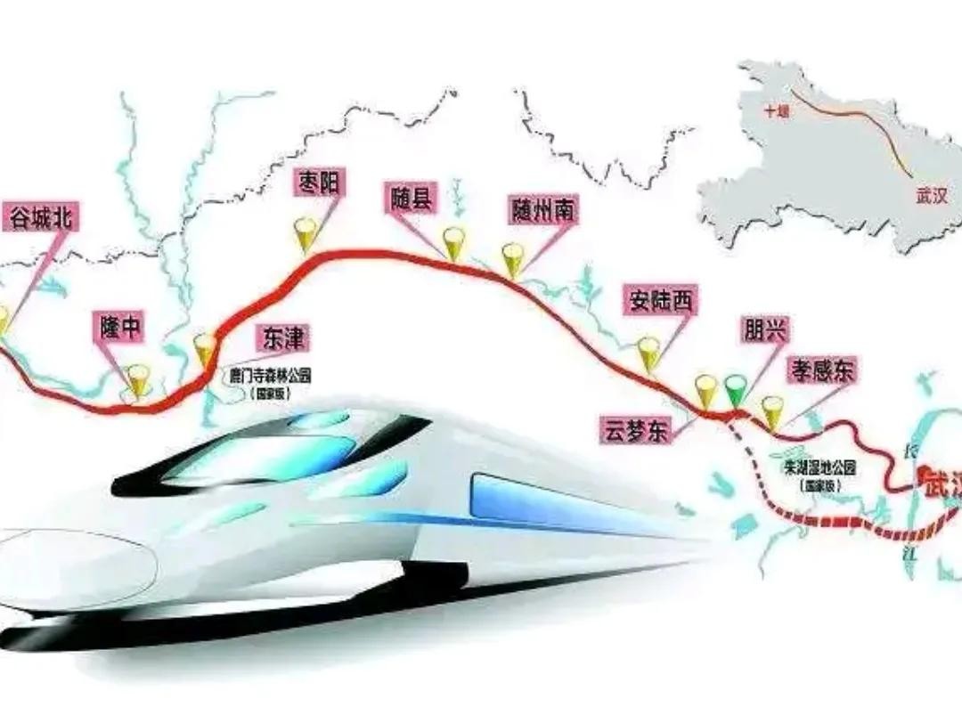 共设立十二个高铁站,分别为:武汉汉口站、孝感东站、朋兴站、孝感西站、安陆西站、随州南站、枣阳站、襄阳东津站、隆中站、谷城北站、丹江口南站、武当山西站、十堰北站。