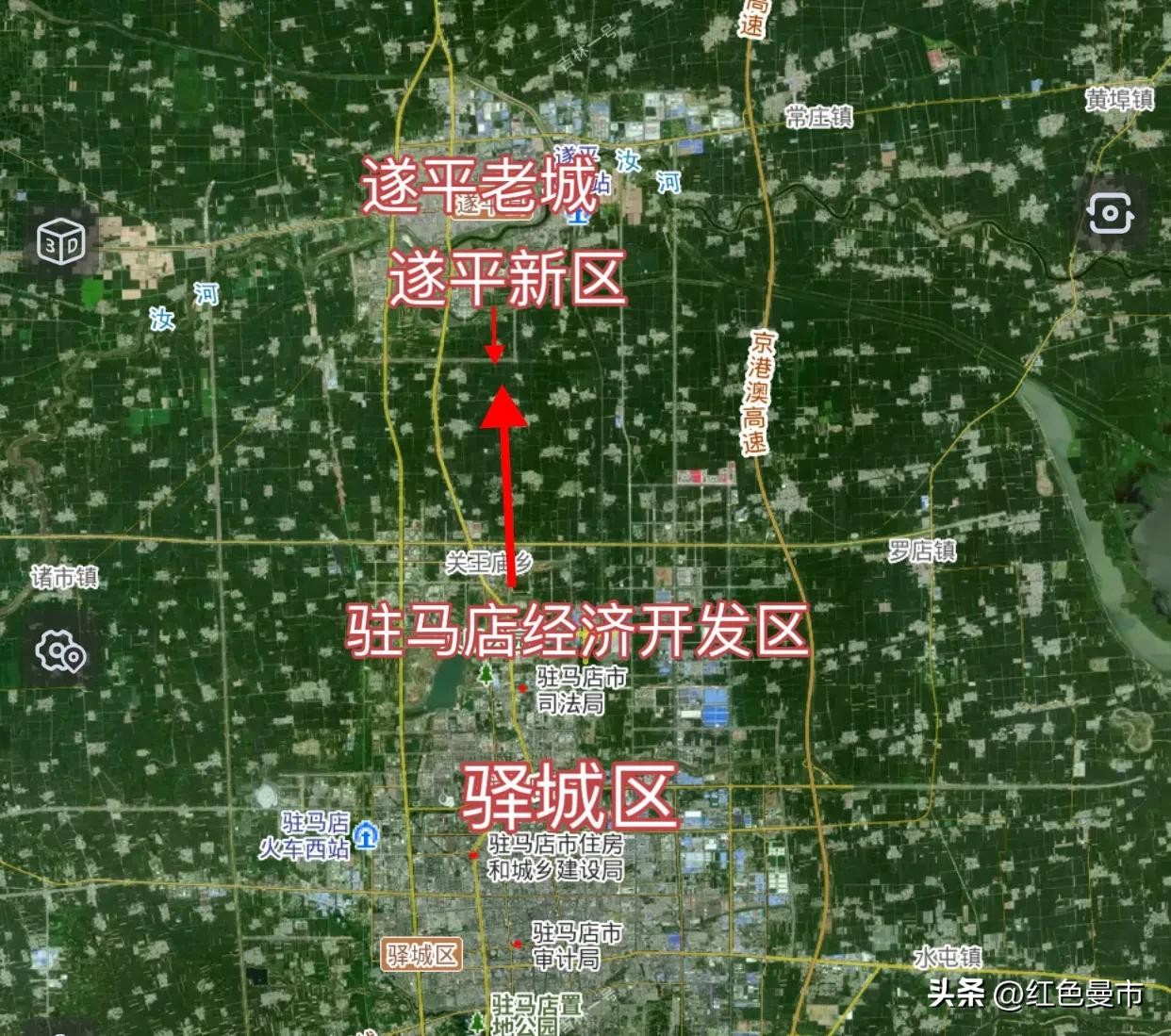 对遂平县而言,继关王庙乡被划入驿城区(由驻马店经开区代管)后,县城就“暴露”在了驻马店市区面前。但遂平县并没有选择向空间更大的城北发展,而是向南跨过汝河建设遂平新区。如今新区内的玉湖生态文化园向南3-4公里就是与关王庙乡的交界处。