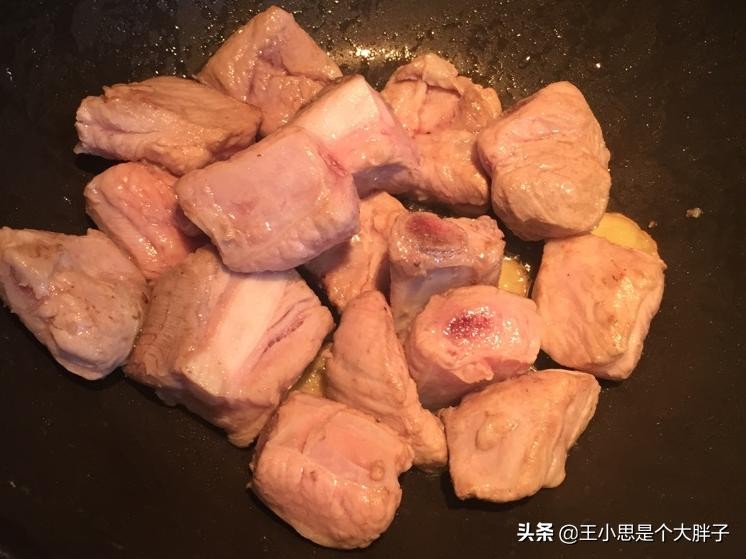 2、锅里倒入适量油,倒入排骨段,用小火煎一会儿,把表面煎得颜色金黄,放入几个葱段、姜片、八角炒香。