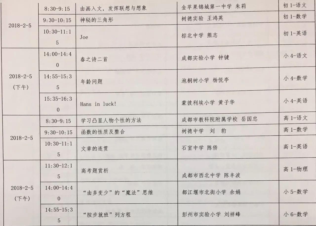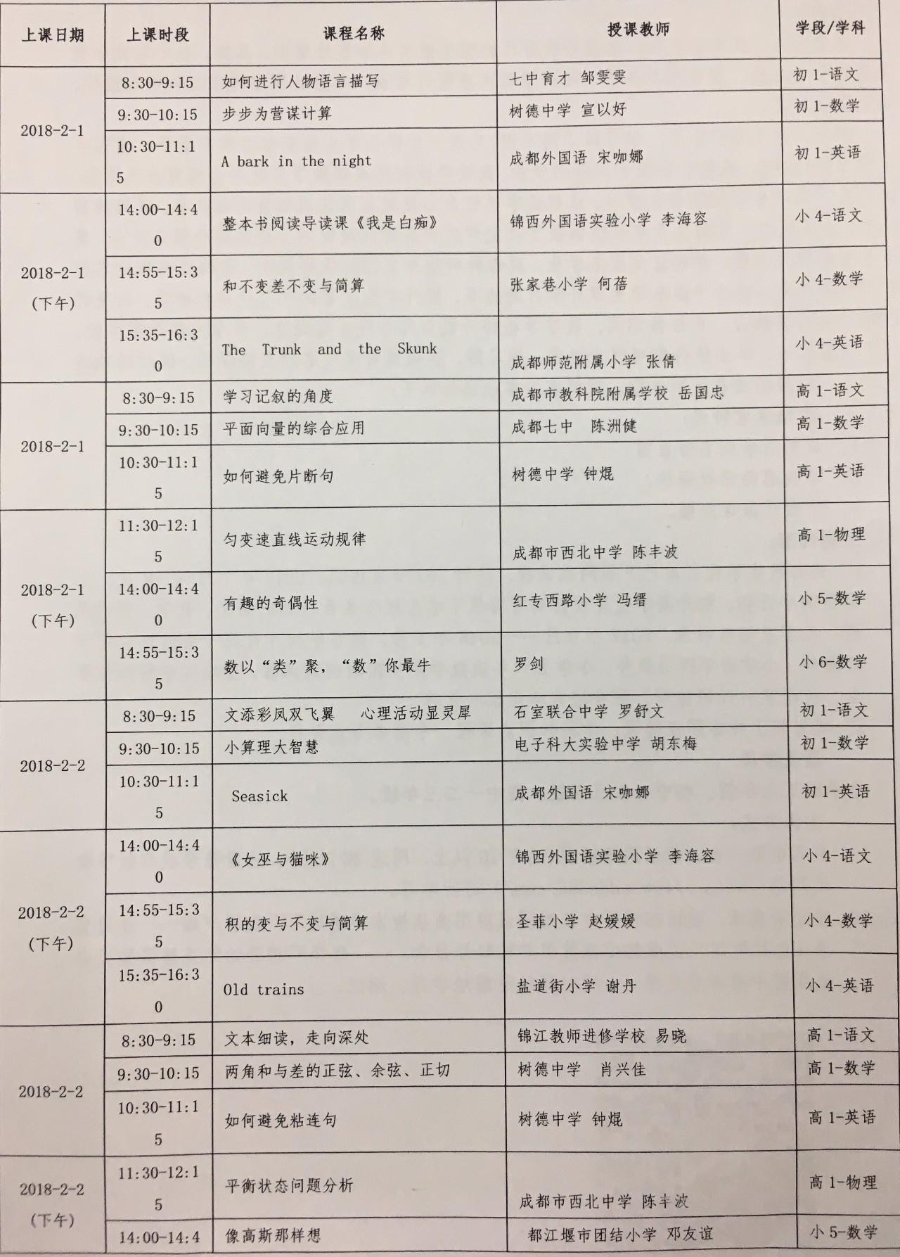 寒假期间,成都数字学校将开设名师在线专题课堂(课程表附后),七中育才、树德中学、成都外国语学校、成都七中、石室联合中学、石室中学、成都市实验小学、泡桐树小学等名校名师将轮番上线,为同学们回顾和梳理各个学科的知识点,以及详解中、高考考点等内容,成都区域学生可免费观看学习。
