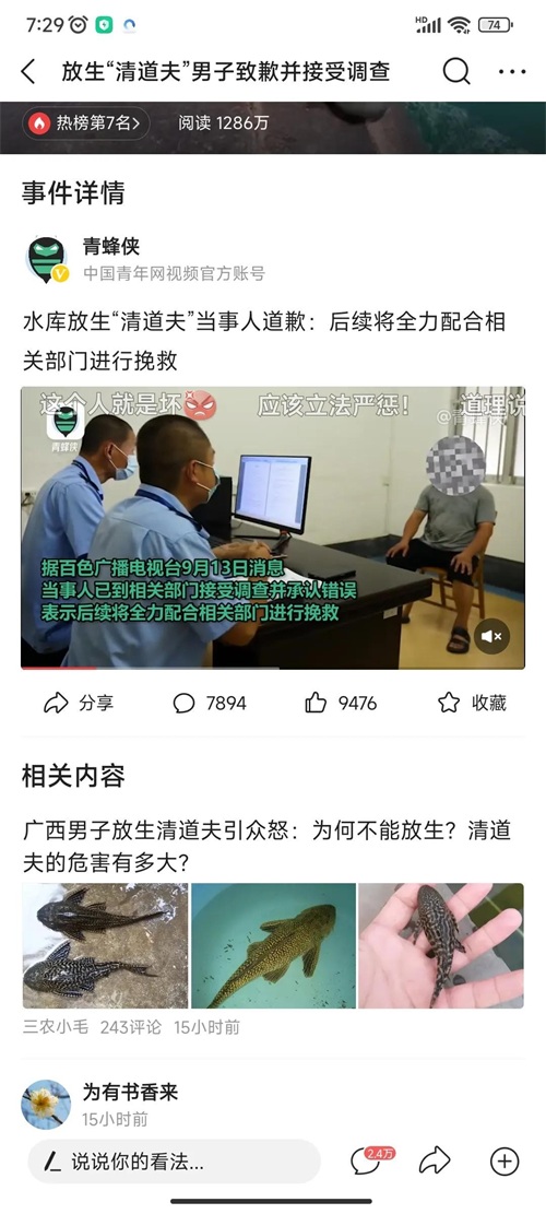 广西男子竟买清道夫放生水库,以为行善却因无知造成重大错误,严重危害生态环境,依法追究责任。