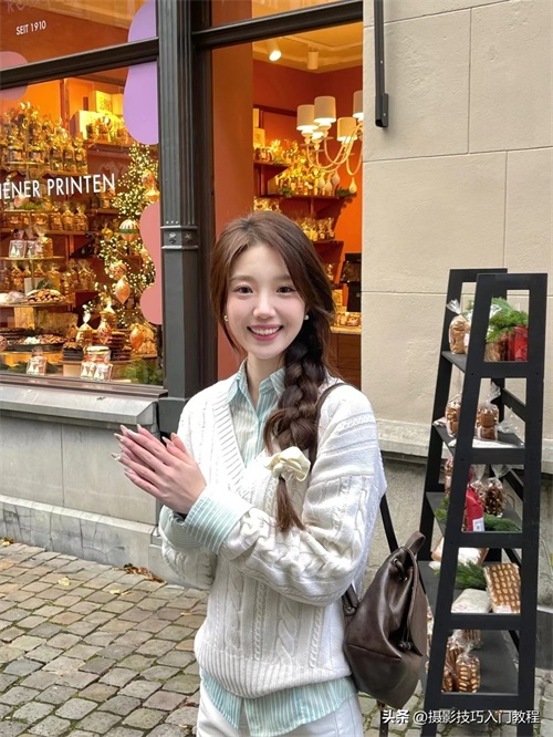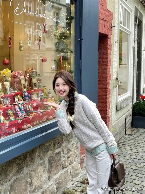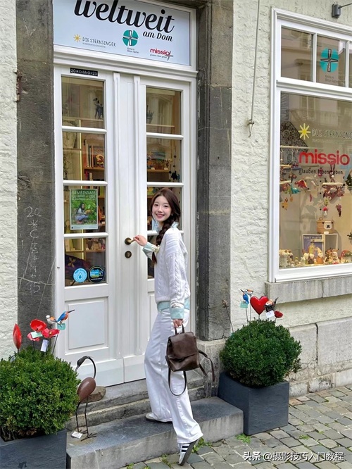 4、遇到好看的店铺,可以模仿推门而入的这个动作,回头看向镜头。