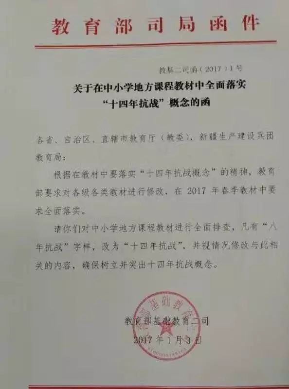 官方通告:抗战时间为十四年