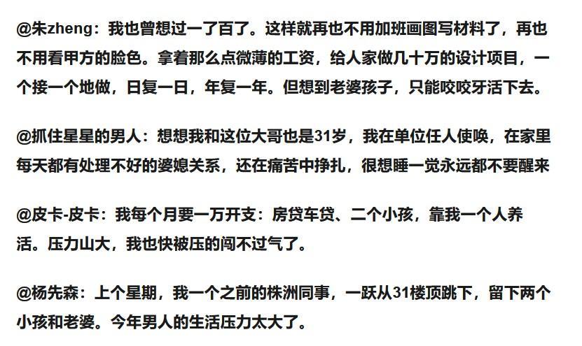 在男子自杀的新闻下面有太多人在讲述自己的苦难,似乎每个人都经历过人生的“至暗时刻”,他们并不期待能在互联网上获得什么解决办法,只是在找一个窗口来抒发自己的情绪罢了,毕竟人生就是一场苦难的修行,能真正拥抱人生并且热爱它的都是英雄。