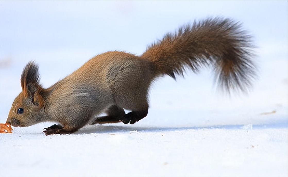 雪地松鼠,一年换毛两季。成年体型长25cm左右,尾长可以贴背到颈部,有些可以达头部。雪地松鼠的作息时间:天明而起,天黑而息。早晚觅食货源,中午基本上在树上隐蔽处休息。每年繁殖1~2胎,每窝4~6只。雪地松鼠夏季毛色橘红或者橘黄色,全身有少量的灰白毛色。夏季耳毛可能没有或者稀疏。冬季灰白色全身,四肢跟耳朵是橘红色,耳毛可以长达10cm,每年8月份以后开始长耳毛。南方地区可能会延迟,一般低于10度会换毛。雪地松鼠以核桃为主,野果为辅。
