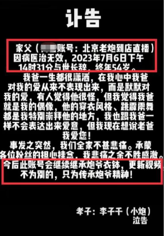 北京炮爷的儿子李子千在7月11日,用其父亲的账号,向粉丝宣布北京炮爷不幸离世的消息。2023年7月6日14时31分,北京炮爷因突发心梗,抢救无效与世长辞,北京炮爷走的时候,也不过才54岁的年纪。
