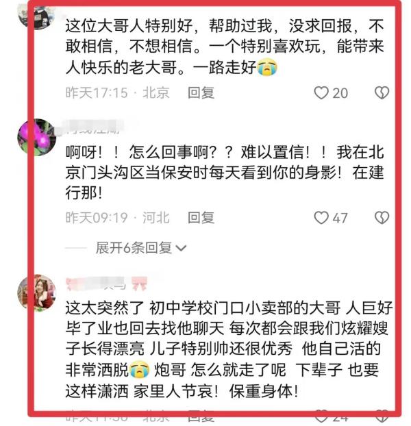 在北京炮爷逝世后,有网友在其作品下评论,曾经接受过北京炮爷不求回报的帮助。还有网友表示北京炮爷年轻时候,在小卖部工作时,经常向同学们炫耀嫂子长得非常漂亮,儿子非常帅特别优秀,而北京炮爷自身活的特别潇洒。从网友的话语中,能够感受到他们对北京炮爷浓浓的不舍。