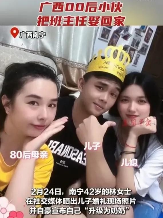 她说自己儿子大学是在南宁本地的高校就读的,学习期间,看到自己班主任后,就直接一见钟情了,经过一年多的努力,两个人成功走到了一起。