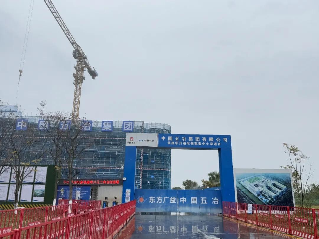 继续前行,项目大门映入眼帘。大门横幅上清晰地标注着“中国五冶集团有限公司承建华月路东侧配套中小学项目”,右侧张贴着学校的效果图,其正是官方发布的成都嘉祥龙潭新城学校的效果图。