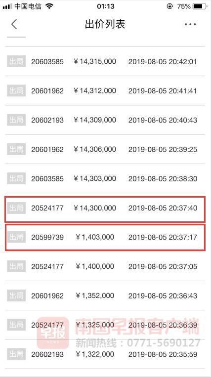 为什么一辆全新也不会超过600万的宾利会被竞拍到至1400多万元?记者查询了该车的竞拍记录,发现该车的第139次出价为”1403000“元,而之后的第140次由另一位竞买人出价”14300000“。