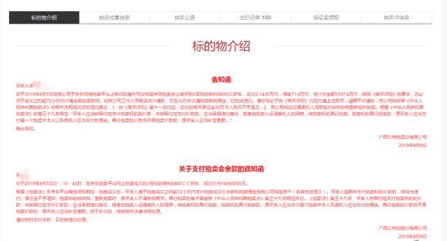 广西公物拍卖行有限公司发布的最新告知函称,按照《竞买须知》要求,李女士必须于成交之时起72小时内付清全部拍卖款项。但该公司工作人员电话多次催款,李女士至今仍未交清拍卖款和佣金,已构成违约。