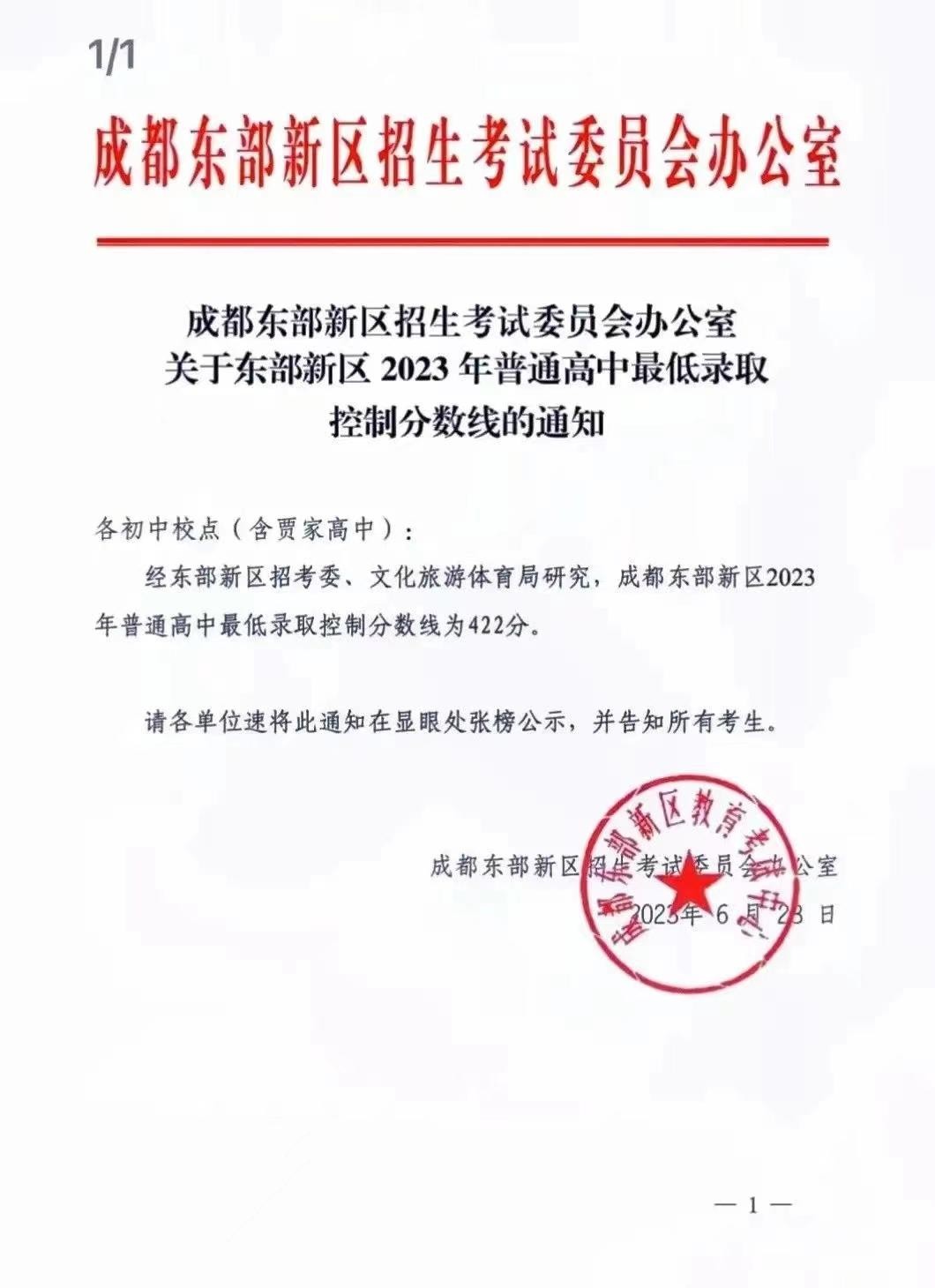三、经研究确定,2023年龙泉驿区中考第二批录取普通高中最低送档线为530分、第三批录取普通高中最低送档线为499分、第四批录取职普融通班最低送档线为459分。