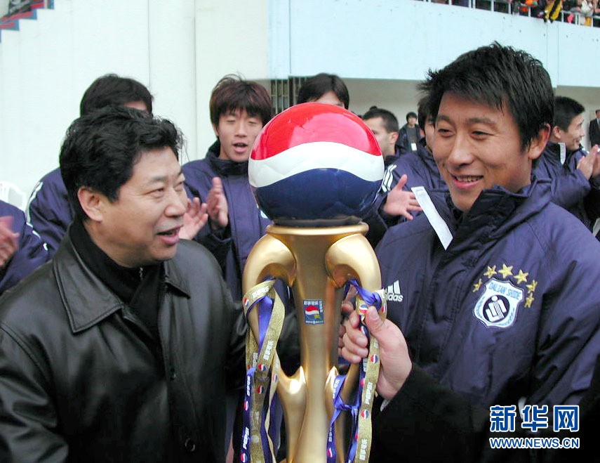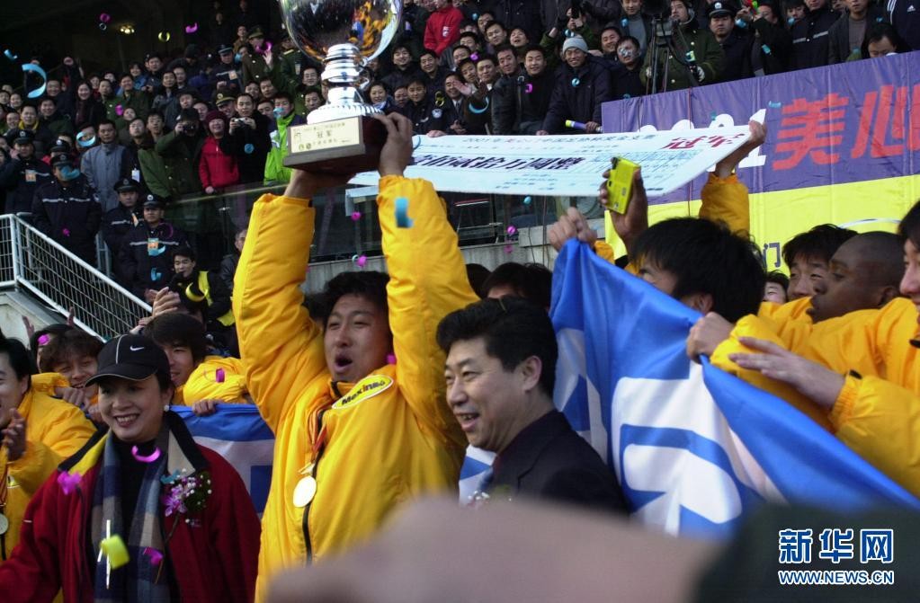 图为2001年12月16日,大连实德队客场战平青岛啤酒队,赢得2001年足球甲A联赛冠军奖杯。这是在青岛颐中体育场举行的颁奖仪式上,大连队队长张恩华(右)从中国足协副主席张吉龙手中接过冠军奖杯。