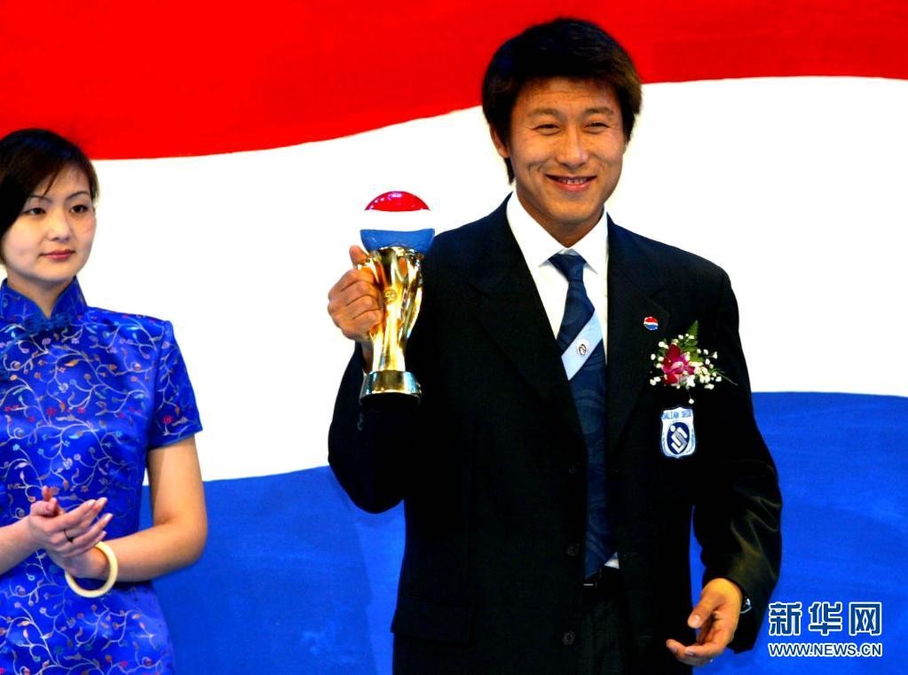 图为2002年12月8日,张恩华在百事可乐足球联赛2002精英评选颁奖典礼上代表获得最佳阵容奖的大连实德队领奖。