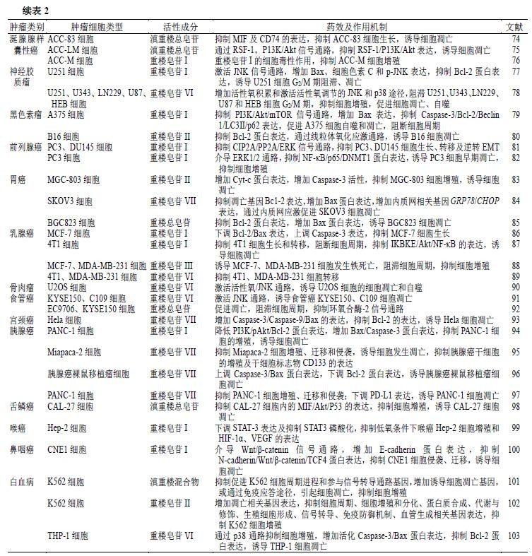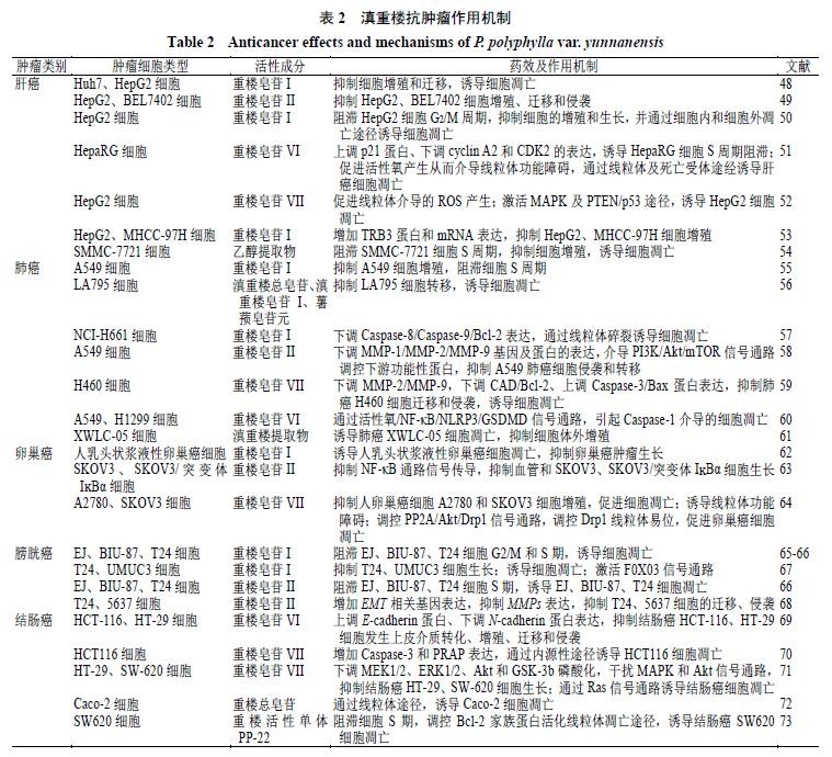 抗肿瘤领域的相关研究是滇重楼药效研究的热点。目前主要集中在皂苷类成分的抗肿瘤及其作用机制,研究发现其对肝癌、肺癌、卵巢癌、膀胱癌、结肠癌、涎腺腺样囊性癌、神经胶质瘤、黑色素瘤、前列腺癌、胃癌、乳腺癌、骨肉瘤、食管癌、宫颈癌、胰腺癌、舌鳞癌、喉癌、鼻咽癌、白血病等多种肿瘤细胞具有抑制作用;作用机制主要为抑制肿瘤细胞增殖、诱导肿瘤细胞凋亡或阻碍细胞生长周期等;作用通道主要有蛋白激酶B(Akt)/核因子-κB(NF-κB)、磷脂酰肌醇-3-激酶(PI3K)/Akt/雷帕霉素靶分子(mTOR)和丝裂原活化蛋白激酶(MAPK)/Akt等通路,相关药理作用及机制见表2。