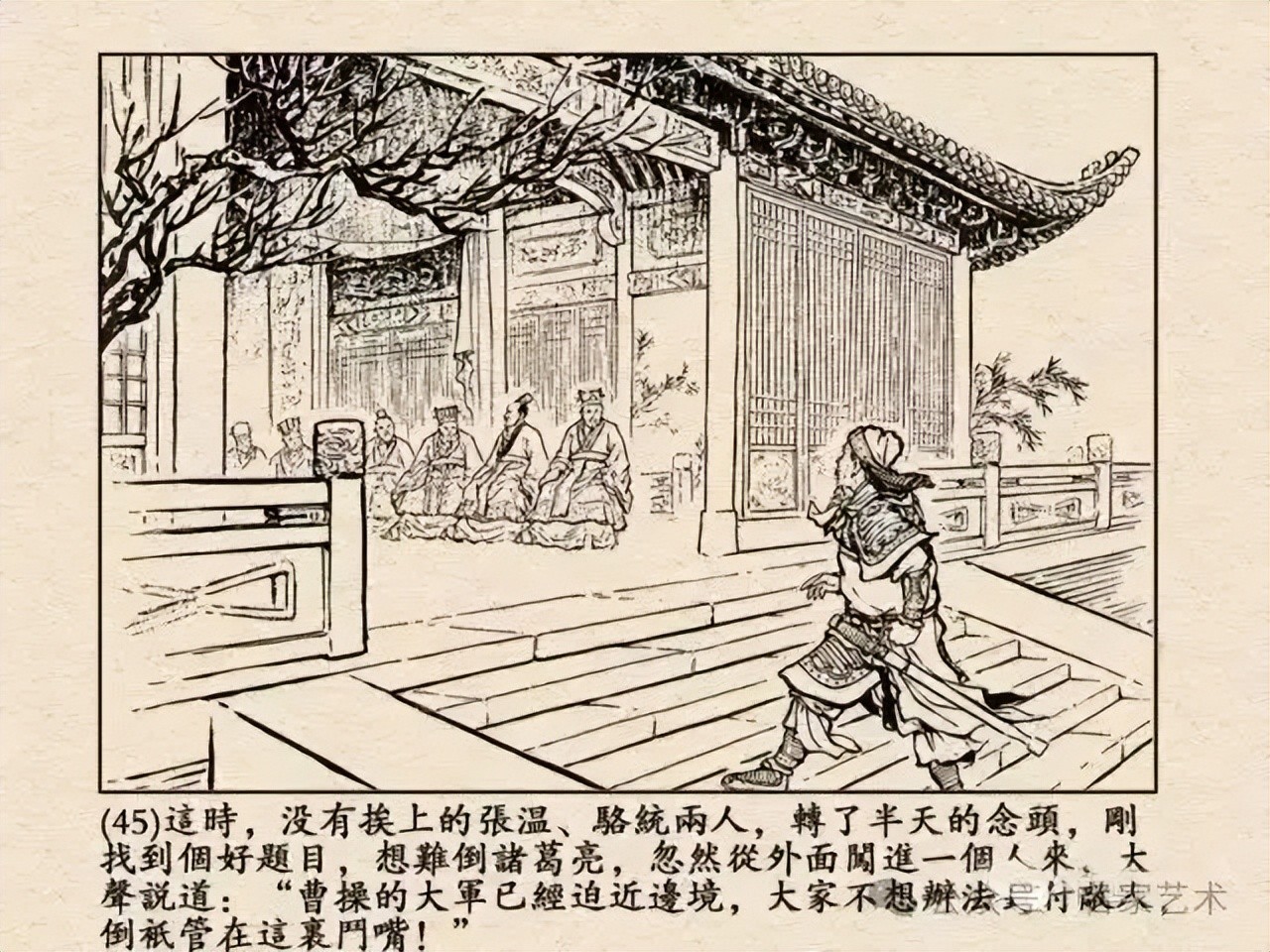 话说东吴的那一众投降派文官,相约来到驿馆,明为迎接孔明,实则刁难,试图打压孔明对双方结盟的信心和决心。
