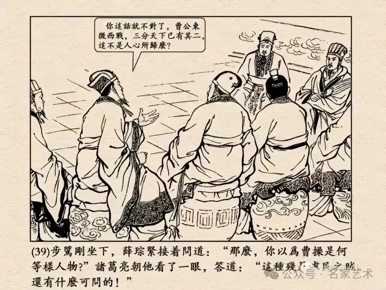 薛综跳出来质问孔明:“先生以为曹操是什么人?”孔明脱口而出:“自然是汉贼。”薛综继续说:“当今汉朝气数已尽,曹操顺应天命,已经占领了天下的三分之二,而刘豫州却不顺天命敢与曹操抗衡,简直是以卵击石!”