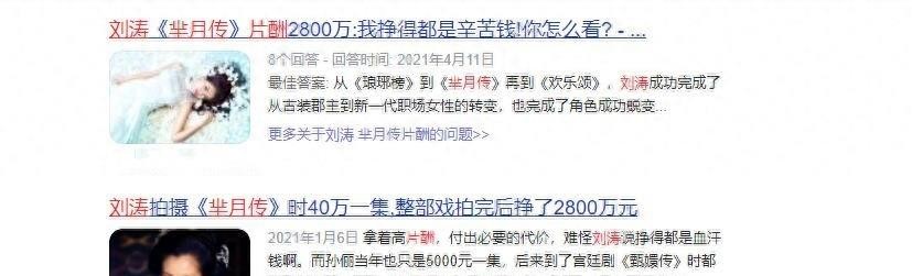 在嫁给王柯之前,刘涛就已经奠定了自己的知名女演员的地位。她的代表角色有穆萨、白素贞、阿朱等,换句话说,她的片酬绝不是“新秀价”。 2015年,在媒体公布的艺人片酬名单中,刘涛的片酬虽然排在孙俪、杨幂之后,但仍高达每集50万,套餐价格为每集20万至35万。由此看来,说她拍戏拿了2800万片酬也不无道理。