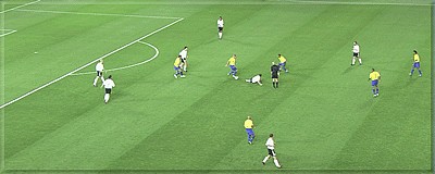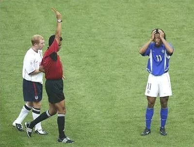 世界杯八强战,巴西队和英格兰队狭路相逢。上半场开场不久,欧文抓住卢西奥的停球失误,为英格兰队取得领先。比分落后的巴西队并不紧张,在上半场结束前由小罗纳尔多中路突破助攻里瓦尔多破门,将比分扳平。下半场比赛中,罗纳尔迪尼奥的一脚天外飞仙,为巴西队反超了比分。但在随后的比赛中,过于兴奋的罗纳尔迪尼奥因为犯规动作过大而被红牌罚下。虽然最终巴西队涉险过关,但罗纳尔迪尼奥因为红牌停赛,以及罗纳尔多的旧伤复发,都给巴西队蒙上了阴影。