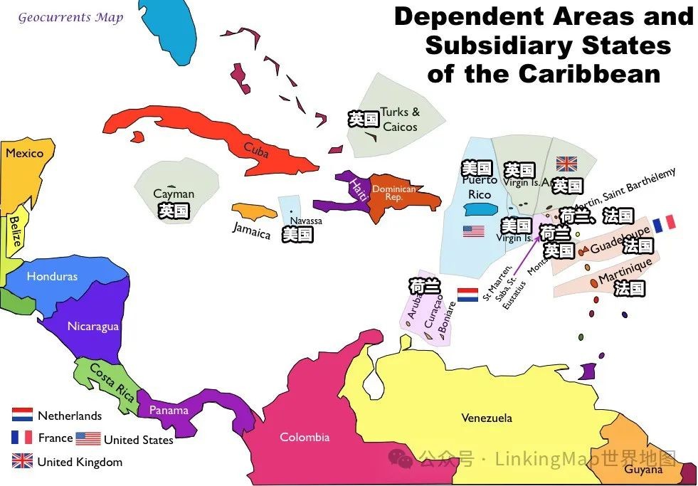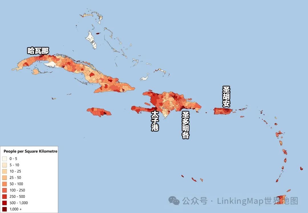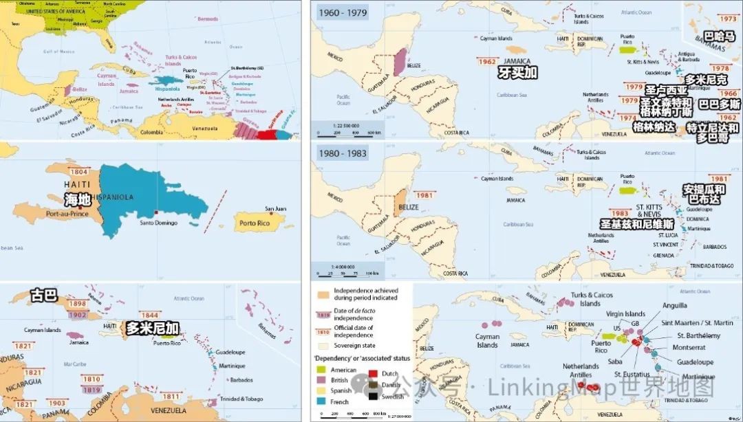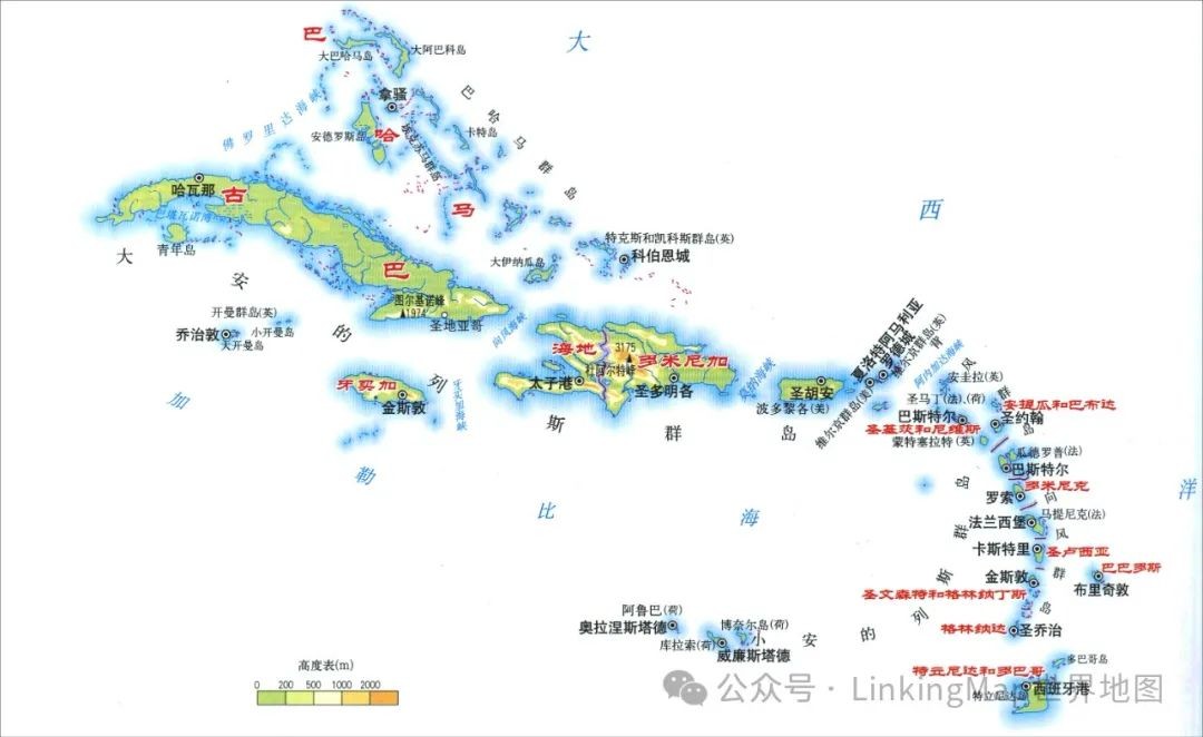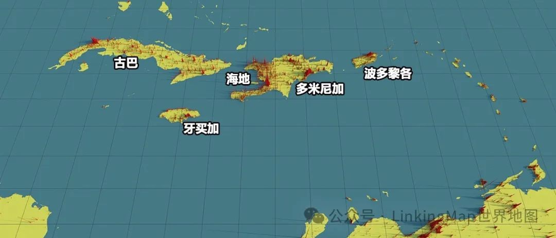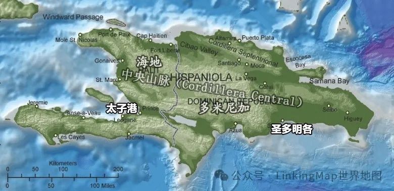 ▲伊斯帕尼奥拉岛:分属海地、多米尼加两国,拥有加勒比海岛屿最高峰(海拔超过3000米)。历史上这里建立了西班牙在的第一个殖民地和历史最悠久的欧洲城市,19世纪初,岛上建立起拉美殖民后的第一个独立共和国,也是历史上第一个黑人共和国——海地