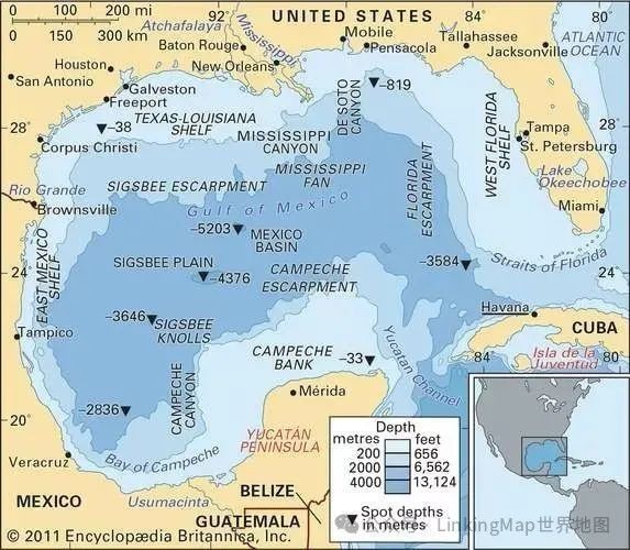 墨西哥湾是美国、墨西哥、古巴三国合围的一处海湾,与加勒比海通过尤卡坦海峡相连,北部则通过佛罗里达海峡进出大西洋。墨西哥湾历史上长期由新西班牙总督区统治,18世纪后期,密西西比河流域以及河口地带成为法国殖民地——法属路易斯安娜。1821年,佛罗里达并入美国,1845年,德克萨斯并入美国,美国、墨西哥各领墨西哥湾北、南部海岸线。墨西哥湾今天是美国重要的石油产地,因此成为美国能源的支柱。