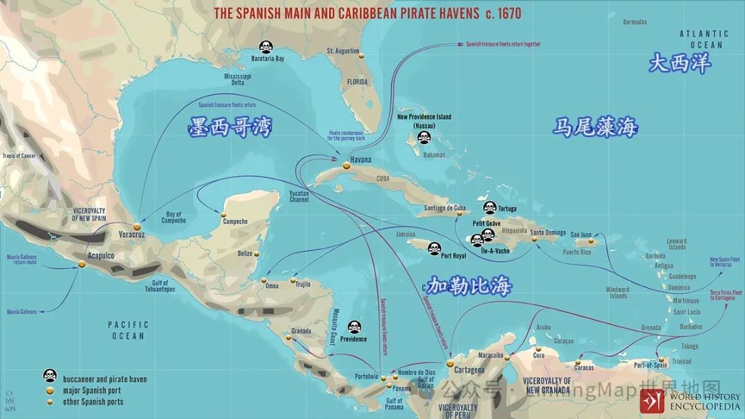 ▲西班牙统治时期加勒比海地区海盗据点分布