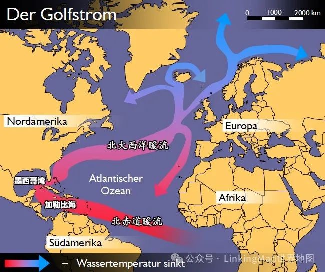 ▲著名的北大西洋暖流,经过加勒比海、墨西哥湾进一步升温后流向欧洲,显著提高西欧沿岸的气温,也推动形成北海、纽芬兰等大型渔场