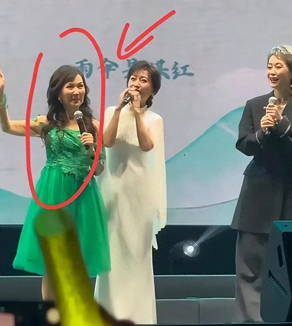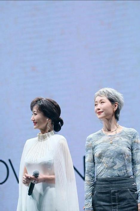 她身着绿衣蓬裙,矗立在众星云集的舞台上,与身旁的赵雅芝相比,更显得衰老。赵雅芝一袭白裙,55岁的容颜仿佛被封存在岁月之外,身形曼妙,神采奕奕,她的光彩仿佛穿越了时光,令人难以移目。