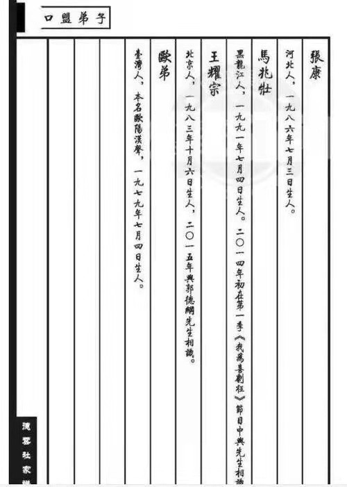 家谱里的的张康和王耀宗都是相声演员。其中王耀宗在15年进入德云社演出序列。但在《德云斗笑社》中孟鹤堂和秦霄贤爆料,王耀宗曾带观众到演出后台,违反了德云家规。目前在德云社小剧场的演出目录下看不到了王耀宗的名字了。
