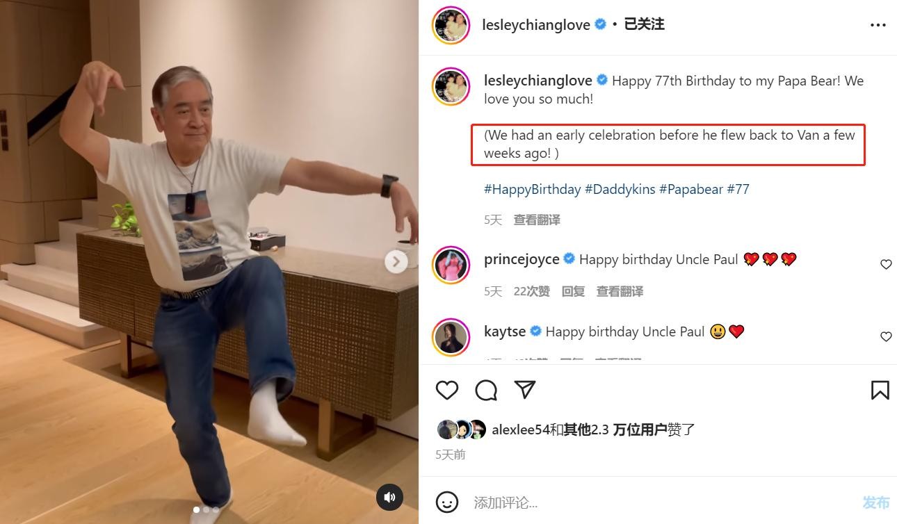 姜丽文留言称,祝爸爸77岁生日快乐,我们非常爱你。最后,她还补充道,爸爸在几周前已出国,我们提前举办了庆祝活动。
