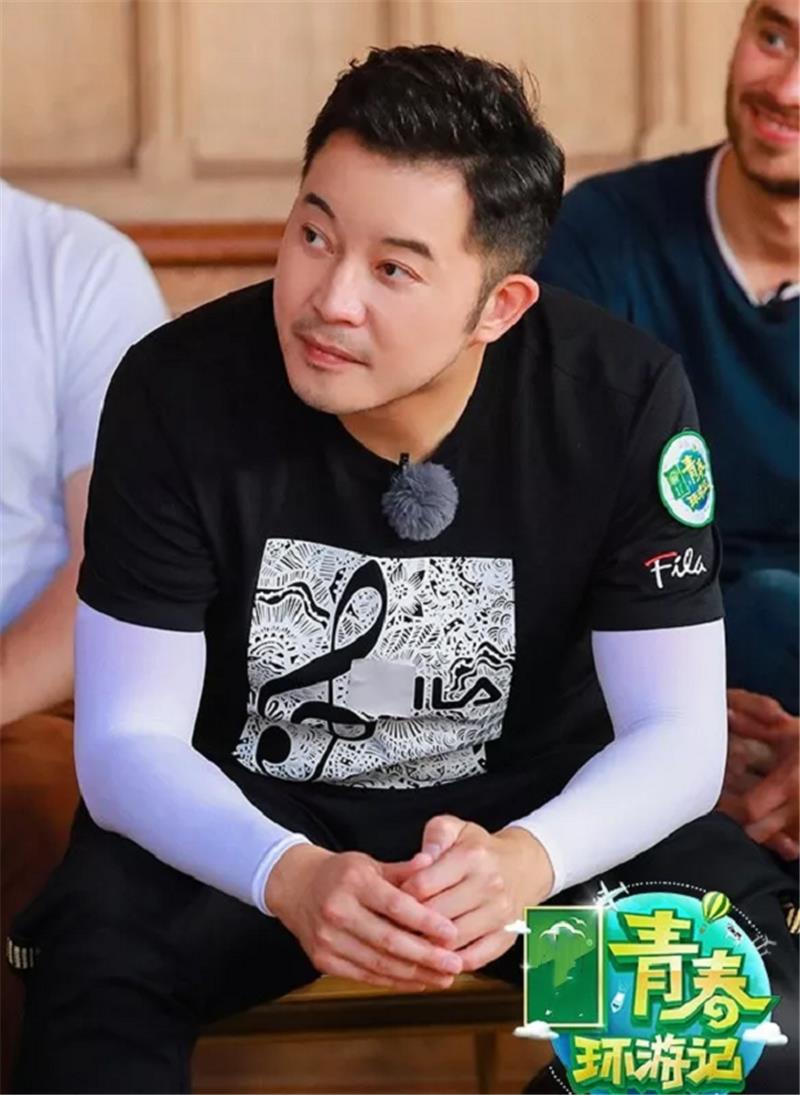 节目中的沙溢穿搭很是绅士,一身黑色印花西装,