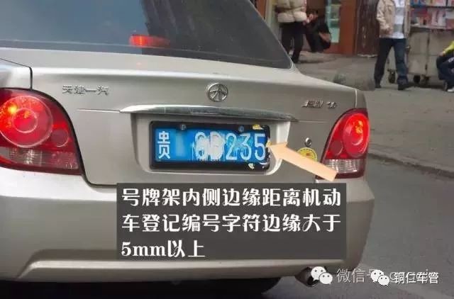 4、使用号牌架辅助安装时,号牌架内侧边缘距离机动车登记编号字符边缘大于5mm以上,不得遮盖生产序列标识。