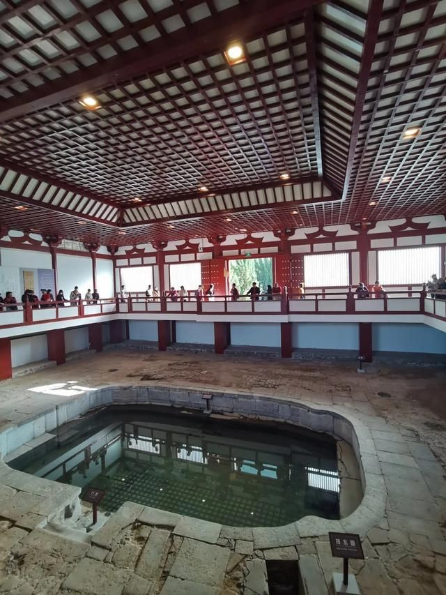 池正中的莲花喷头则如海棠花的花蕊,池身用青石彻筑,雕刻精细。贵妃池东边便是庙玄宗专用御汤。东西长10.6米,南北宽6米,浴池为两层台式,上层台深80厘米,下层台深70厘米,平面呈莲花形状故又称“莲花汤”,可容水100立方米,俨然一座室内游泳池。唐时建有九龙殿,如今大厅内仍可看到当年大殿基址遗迹的柱础。