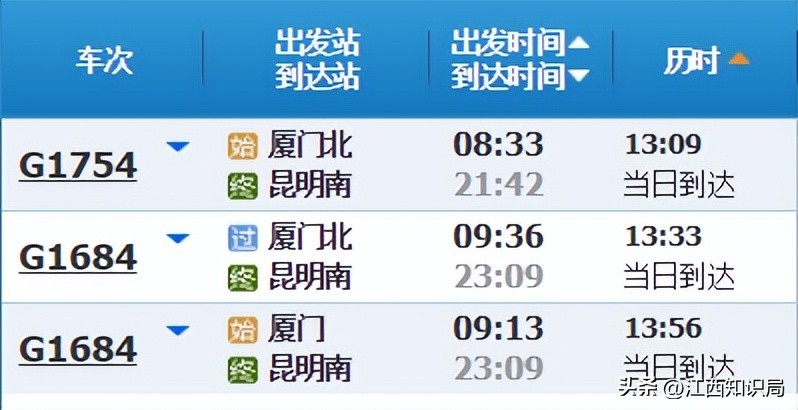 目前,厦门至昆明每天有2个车次的高铁,即G1754次和G1684次列车。